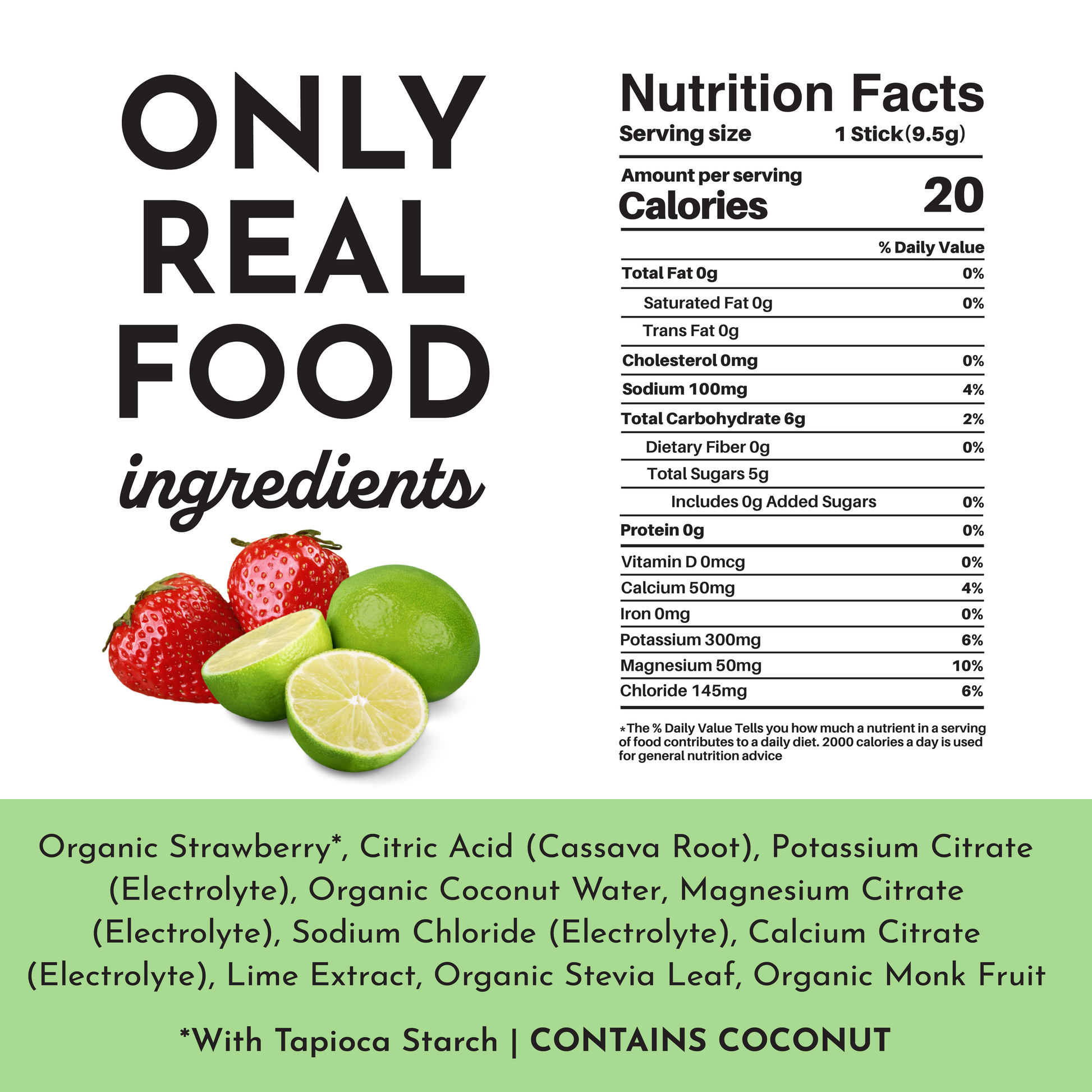 Organic Strawberry*, Citric Acid (Cassava Root), Potassium Citrate (Electrolyte), Organic Coconut Water, Magnesium Citrate (Electrolyte), Sodium Chloride (Electrolyte), Calcium Citrate (Electrolyte), Lime Extract, Organic Stevia Leaf, Organic Monk Fruit
